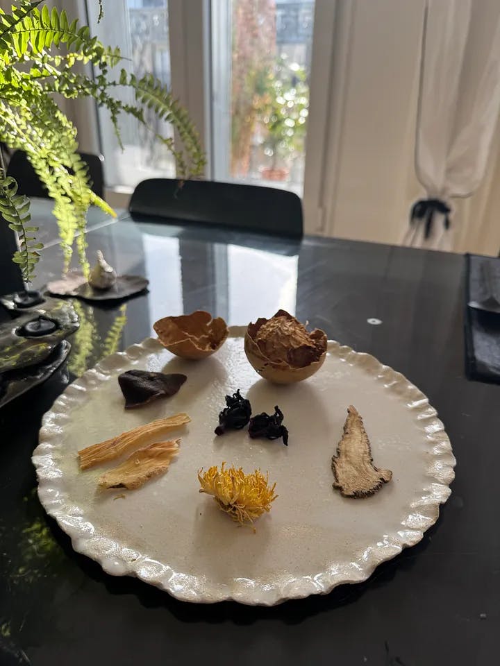 I started questioning my immunity – clearly faltering – and spoke about it with my friend Azusa. I love her graceful approach to cooking and her precise taste at every level: ritual, presentation, gestures, flavours, textures, benefits, and uses in traditional Chinese medicine. It was the beginning of autumn, and she had started making medicinal Chinese soups with reishi and ginseng. I could already imagine the warm, fragrant broth regenerating me from the inside.