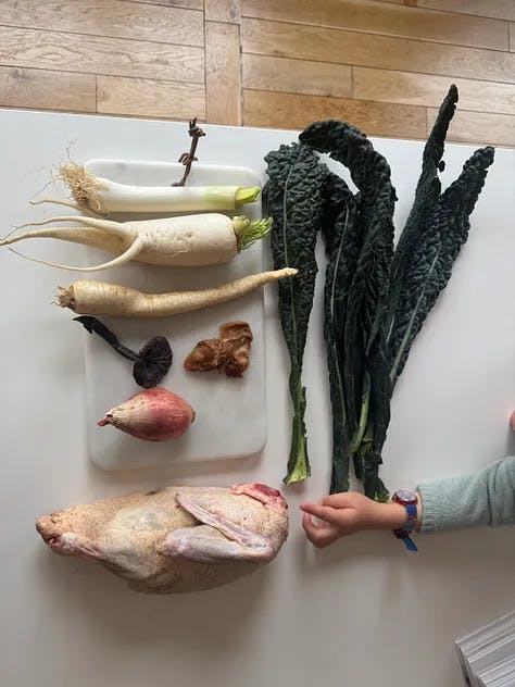 At the next market, I stocked up on everything I needed for my first broth of the season: winter radishes, a duck (cut in front of me, brrrr!!), crooked roots, colourful rhizomes, cavolo nero… With little Abel, I followed Jennifer Hart-Smith’s Scotch Broth recipe to elevate my fresh ingredients and Azusa’s mushrooms into a wonderful broth. The result is completely addictive.
